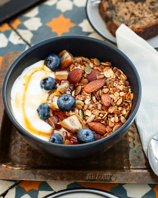 Granola with Greek yogurt, raisins, dried fruits, and seasonal fresh fruit