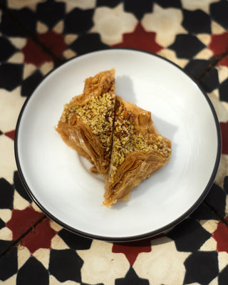 Phyllo dough, precious nuts like pistachios, butter, and honey