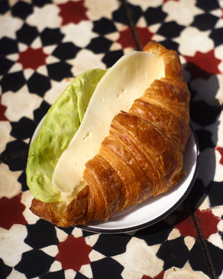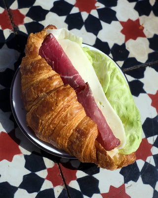 Freshly baked croissant with air-dried beef, Gouda cheese and lettuce
