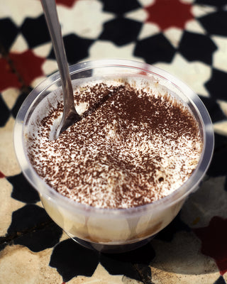 100% mascarpone cheese, coffee, brown sugar, Savoiardi biscuits, and dusted with cocoa powder